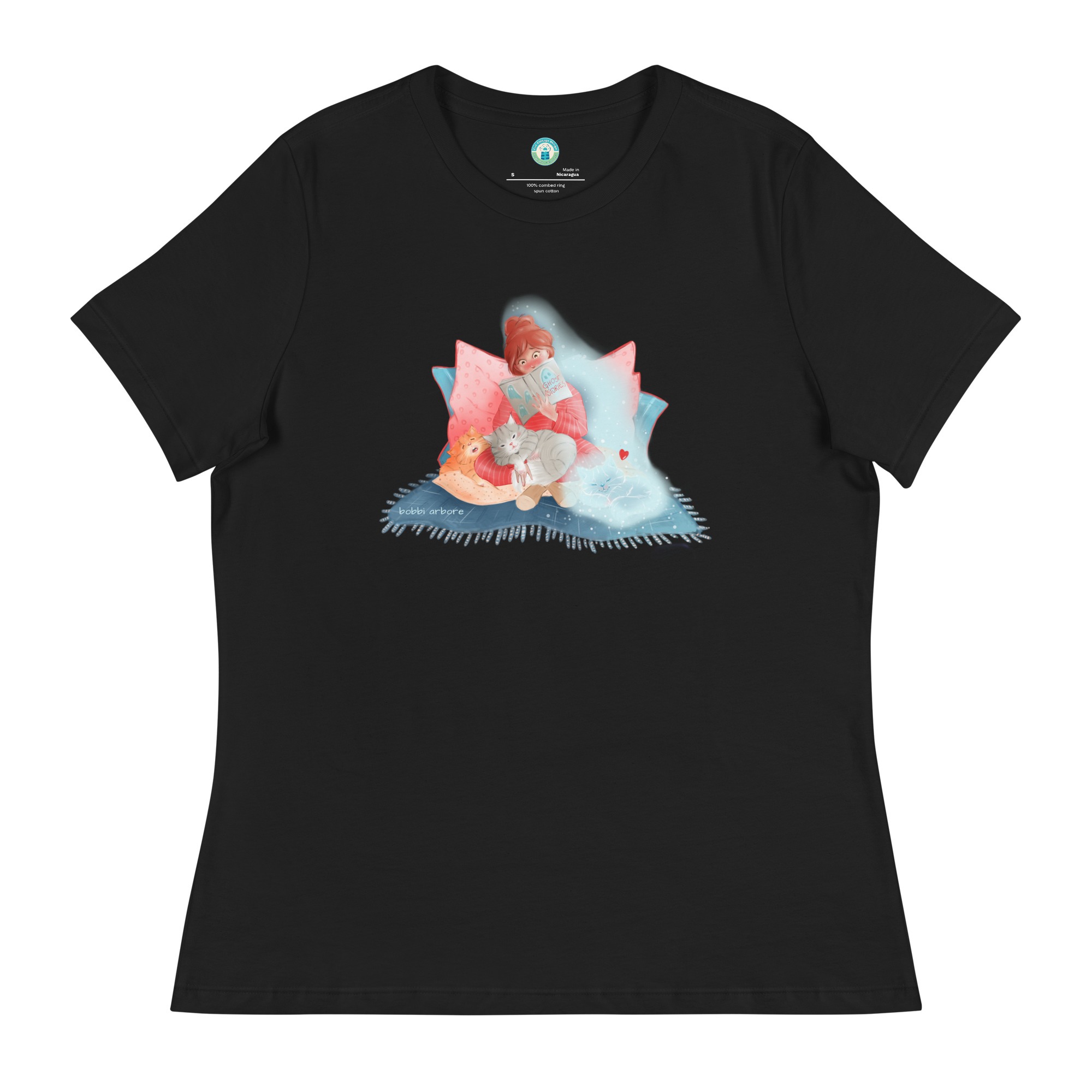 This women’s t-shirt features an illustration of a girl reading horror stories surrounded by her cats, but one is actually a ghost kitty! The little furry ghost is curled beside her, probably just like he did when he was still in our dimension, and looks extremely happy and serene. I drew ‘Always with me’ because I have experienced pet loss many times, yet I believe our cats never really leave us. I hope this happy little ghost kitty on this Women’s T-Shirt will help you remember your pets with a smile.